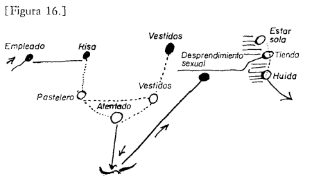 Freud traza un esquema para mostrar cómo sus palabras se relacionan entre sí y emergen en la conciencia a través de sus percepciones y recuerdos. Esta escritura le permite ver cómo la idea más inocente, la «vestido», representa todo el complejo inconsciente: ha tenido lugar la represión acompañada de una formación simbólica («vestido»). La energía, que surge del interior del cuerpo y está separada de sus representaciones originales, se utiliza para formar el símbolo. ¡Esta escritura es la primera mentira! Se produce en el inconsciente por una agencia energética que busca un representante o símbolo más aceptable, siendo el primero reprimido. El resultado de este proceso es el síntoma «bastante racionalmente construido» en el que el símbolo recién formado, «vestido», no juega ningún papel y pasa a la conciencia. Esta es la peculiaridad del caso. El recuerdo reprimido se convierte en el trauma del deseo sexual a través de la acción diferida tras la pubertad («el dependiente me resultaba sexualmente agradable»). La pluma de Freud en la página hace que estas ideas sean apercibidas; su creencia en una energía sexual lo limita.
